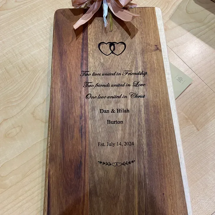 Our family uses precision laser technology to create clean, detailed designs on wooden surfaces. Our process ensures crisp lines, lasting quality, and a professional finish on every piece. Whether it’s a personalized gift, wedding gift, or a customized piece we bring your ideas to life with care and craftsmanship.